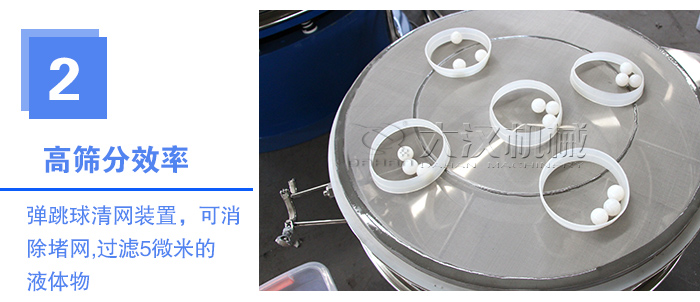 篩網(wǎng)利用率高,篩網(wǎng)下可設(shè)彈跳球清網(wǎng)裝置,可消除堵網(wǎng)現(xiàn)象,加緣式旋振篩可以過濾5微米的液體物料,部件無死角,易清洗消毒。