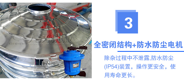 采用全密閉結(jié)構(gòu),可以保證液體物料在除雜過程中不泄露,不影響篩分效率。另外,我們加緣式旋振篩使用的是大功率電機,具有防水防塵(IP54)裝置,操作更安全,使用壽命更長。
