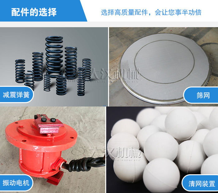 三次元旋振篩配件包括篩網(wǎng),振動電機,清網(wǎng)裝置,減震彈簧等,篩分物料和產(chǎn)量不同,選擇的篩網(wǎng),振動電機以及清網(wǎng)裝置是不同的,距離來說,常見的清網(wǎng)裝置有彈跳球清網(wǎng)裝置、超聲波清網(wǎng)裝置,這兩者的選擇在于物料的難篩程度,針對高粘性,易于堵網(wǎng)的物料,大漢廠家還是建議您選擇超聲波清網(wǎng)裝置,清網(wǎng)效果會更好。