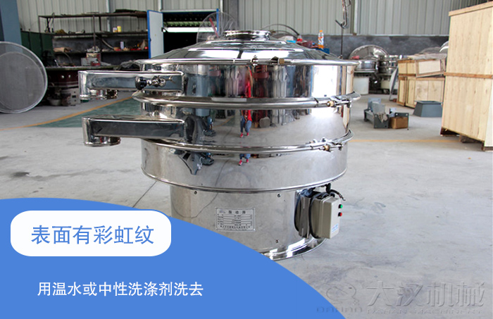 不銹鋼振動(dòng)篩表面有彩虹紋,是過(guò)多使用洗滌劑或油引起,洗滌時(shí)用溫水或中性洗滌劑洗去。