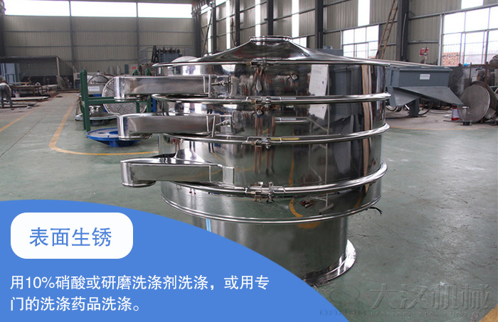 不銹鋼振動(dòng)篩表面的污物引起的銹,可用10%硝酸或研磨洗滌劑洗滌,也可用專門(mén)的洗滌藥品洗滌。