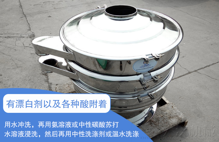 不銹鋼振動(dòng)篩表面有漂白劑以及各種酸附著,立即用水沖洗,再用氨溶液或中性碳酸蘇打水溶液浸洗,然后再用中性洗滌劑或溫水洗滌。