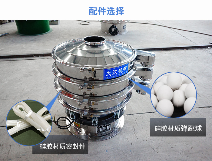 為了配合不銹鋼旋振篩篩分的潔凈性,要求不銹鋼旋振篩的相關(guān)配件也需要達(dá)到一定的標(biāo)準(zhǔn),其清網(wǎng)裝置-彈跳球和密封裝置-密封件要采用食品硅膠材質(zhì),以防止對(duì)物料造成一定的污染性。