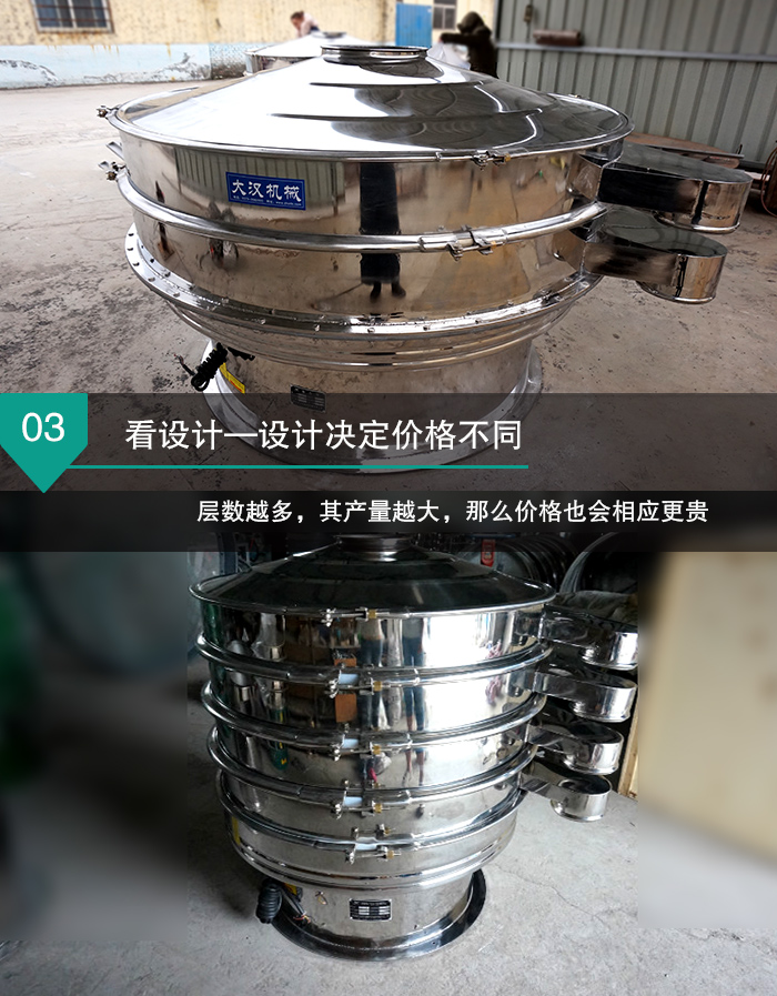 新鄉(xiāng)大漢全不銹篩振動篩生產(chǎn)的直線振動篩型號從DH600到DH2000,不同型號的全不銹鋼振動篩,其直徑、篩網(wǎng)面積是不同的,所以這就決定了不同型號的全不銹鋼振動篩產(chǎn)量是不同的,這也必然會造成全不銹鋼振動篩價格上存在明顯的差異。 看設(shè)計—設(shè)計決定價格不同